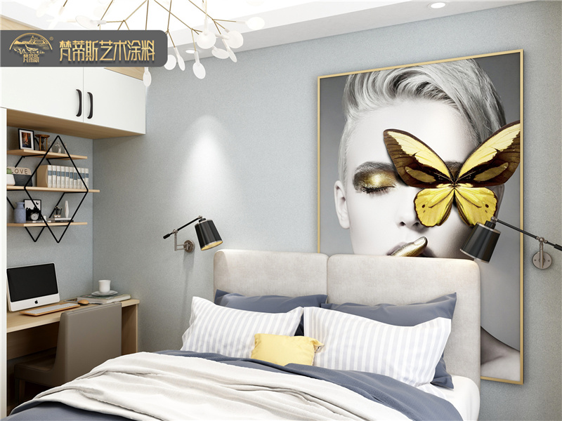 銀鉆砂絨采用德國先進(jìn)工藝,導(dǎo)入納米分離技術(shù)而成,具有細(xì)砂觸感,絲絨的溫暖,柔和的珠光效果,突破傳統(tǒng)涂料單一色彩的局限性,華麗之中依稀著高貴,古典之下隱約著端莊,若隱若現(xiàn)的反光感和神秘感,讓絨面不會(huì)顯得枯燥和單調(diào),反而增添一些輕奢與優(yōu)雅,也許就是您家中所需的藝術(shù)乳膠漆。