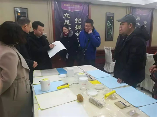 經(jīng)過店面的樣板效果觀摩后,會上還準備了相應(yīng)的藝術(shù)漆系列產(chǎn)品供客戶親身體驗產(chǎn)品的性能及施工工藝,多樣的產(chǎn)品效果、簡單的施工手法即可得到精美的墻面效果,吸引了與會客戶的興趣!