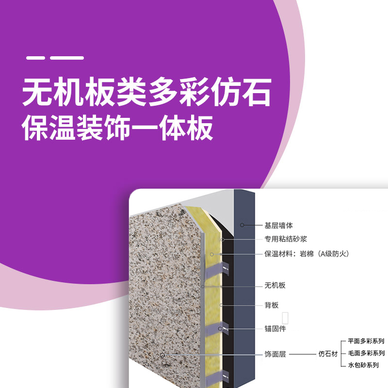 無機板類多彩仿石保溫裝飾一體板選用高密度、高強度A1級無機板為基材,通過精砂、滲透封閉、界面處理、飾面噴涂(輥涂)、固化、養(yǎng)護、復(fù)合等多道現(xiàn)代化生產(chǎn)工序加工成型。